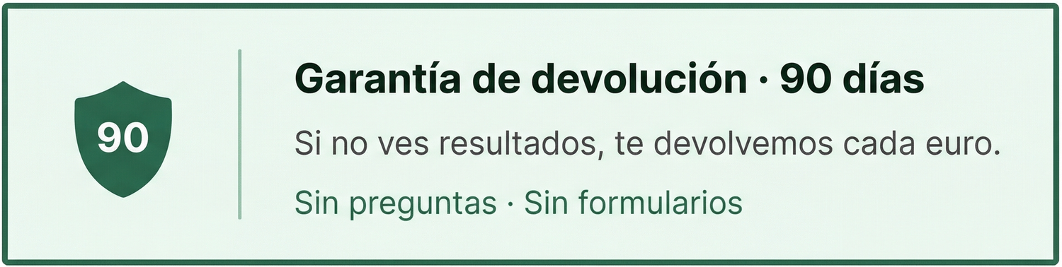 Así funciona: si después de usar el producto no ves mejora, escríbenos a nuestro email. Te enviamos las instrucciones de devolución. Empaquetas el bote. Dinero de vuelta en tu cuenta en 24 horas.