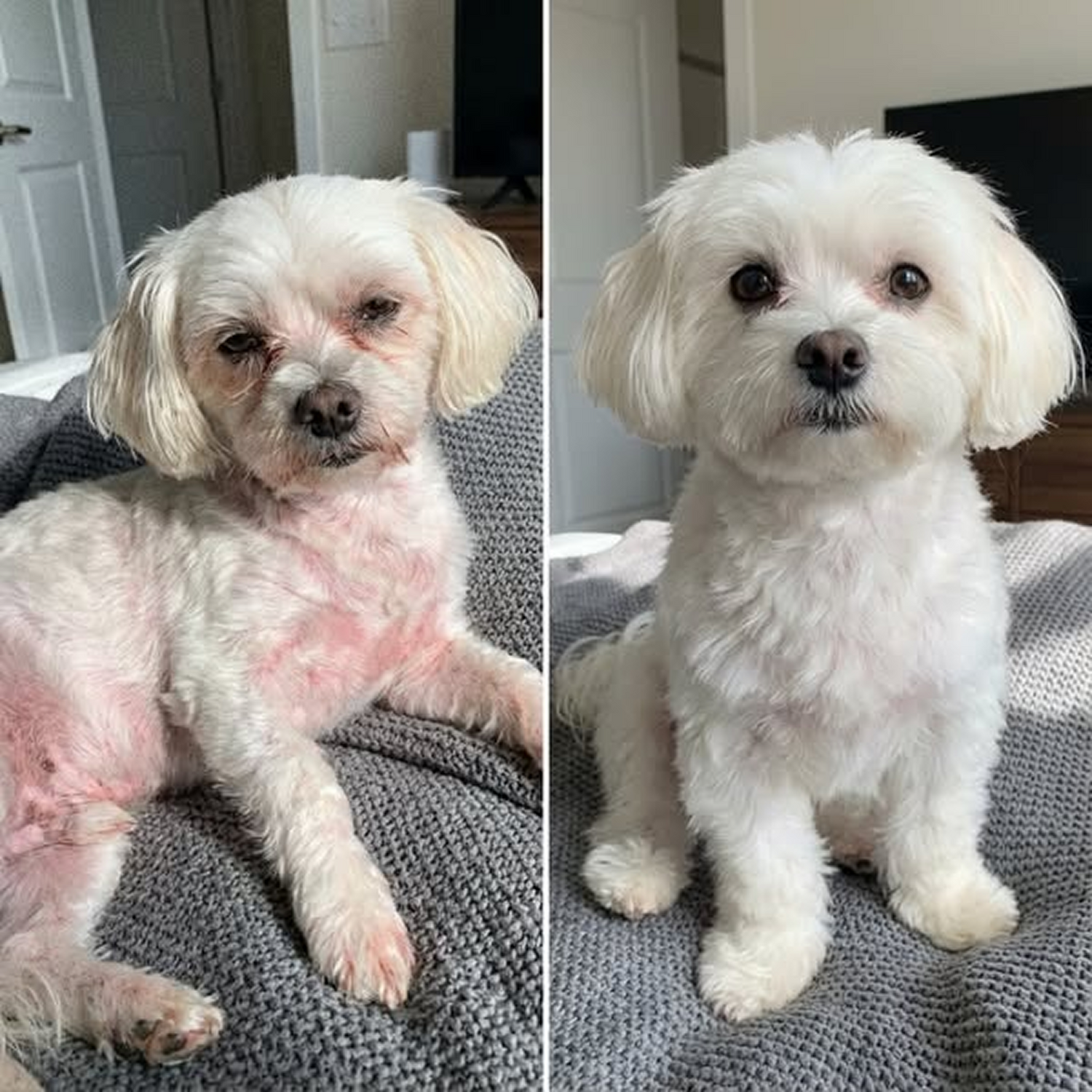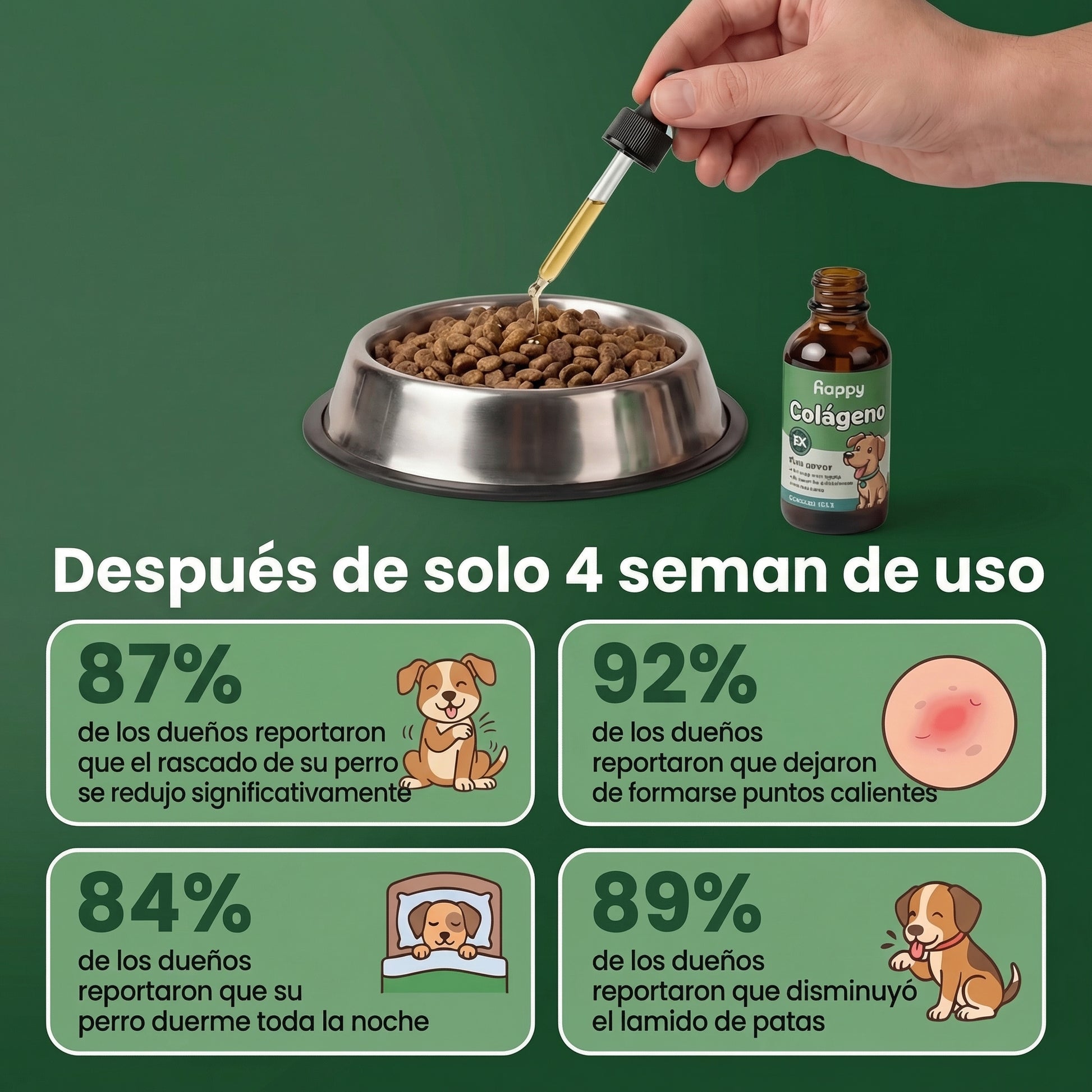 La mayoría de dueños notan menos rascado entre la semana 3 y 4, especialmente de noche — muchos nos escriben diciendo que "por primera vez en meses, dormimos del tirón."